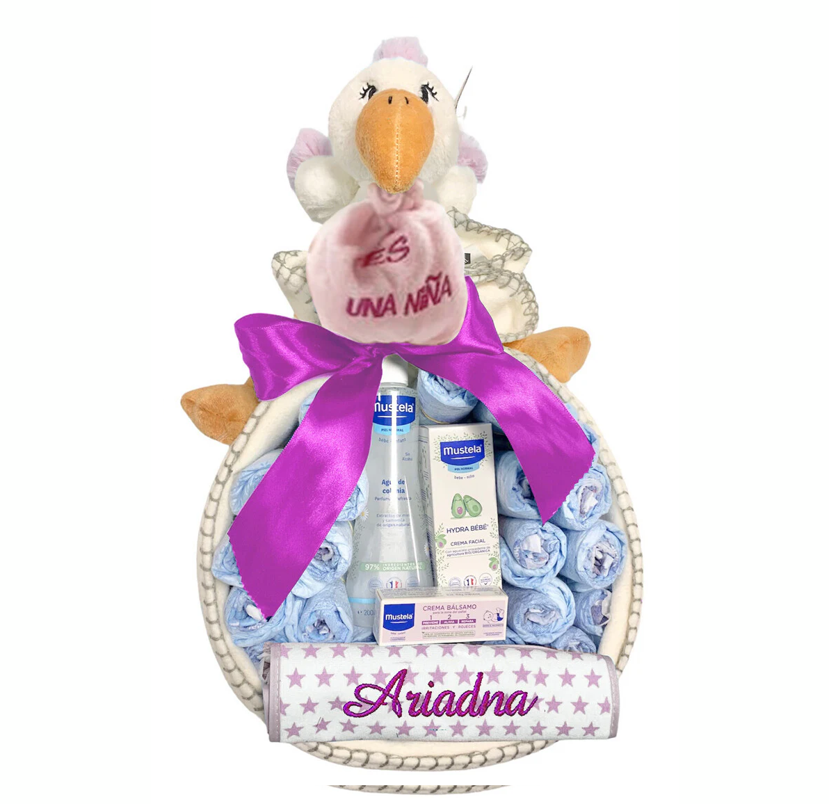 La canastilla se presenta empaquetada con papel celofán transparente y un gran lazo a juego con el tono de la canastilla y una tarjeta de felicitación personalizada.