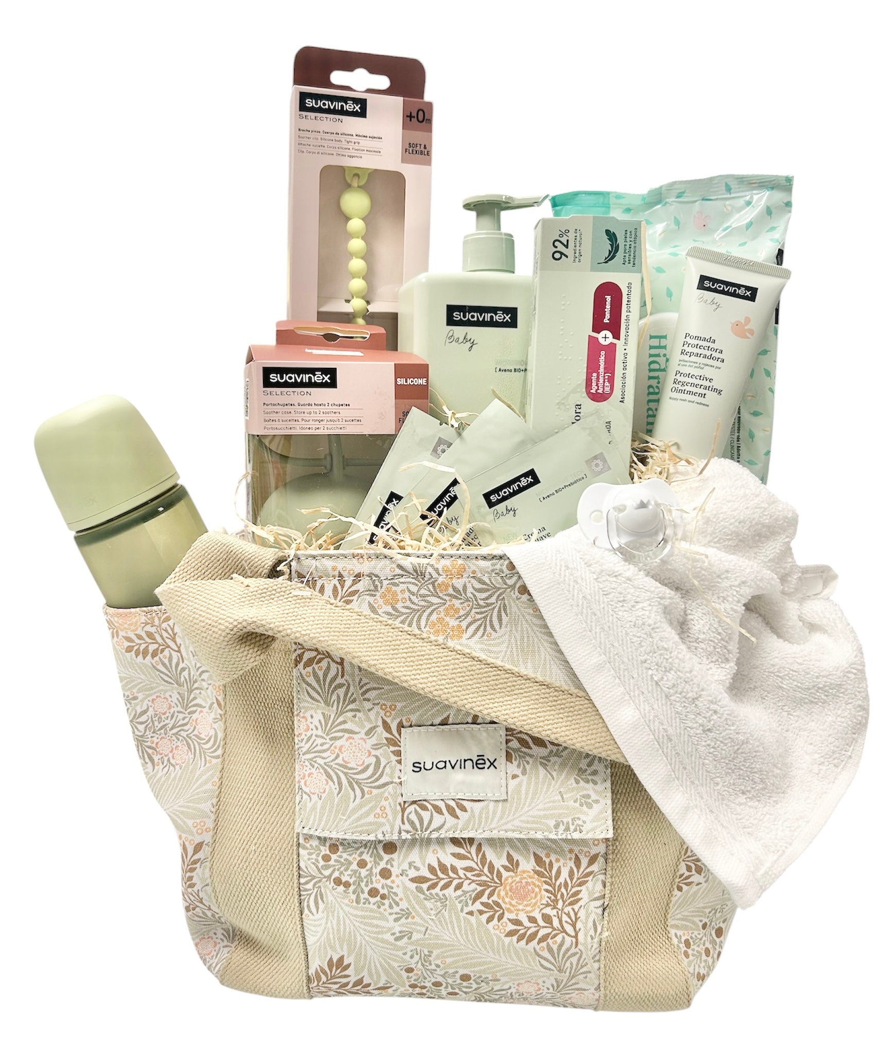 Imagina llegar al hospital o a casa con esta preciosa cesta llena de productos Suavinex, una de las marcas más reconocidas en cuidado infantil. Todo lo que el bebé necesita en sus primeros días, reunido con mimo y presentado de forma impecable.